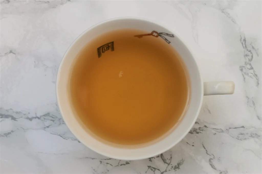 Once I’ve brewed it, the pale clear gold tea liquid has sweeter and lighter pomegranate notes, with that refreshing green tea scent pulling through as well.
