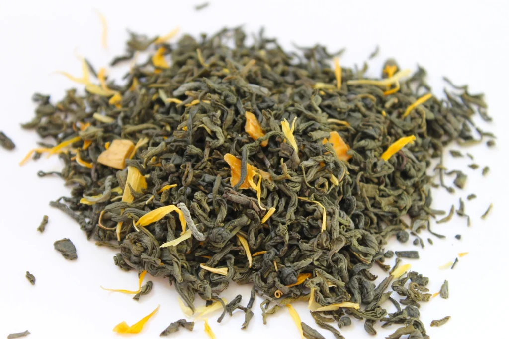 - Blend: Chinese green tea with mango pieces and calendula petals