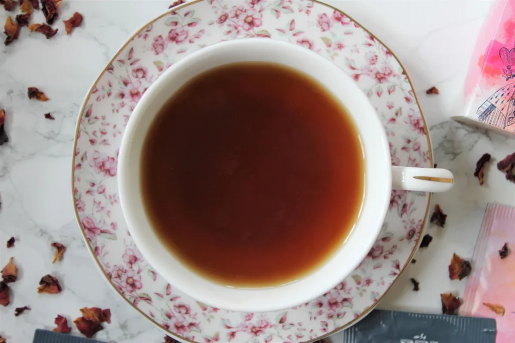 You need to take a few sips for the flavour to develop. Once it does, you’ll love the smoothness of the black tea and fragrance of the rose. It’s delicious!